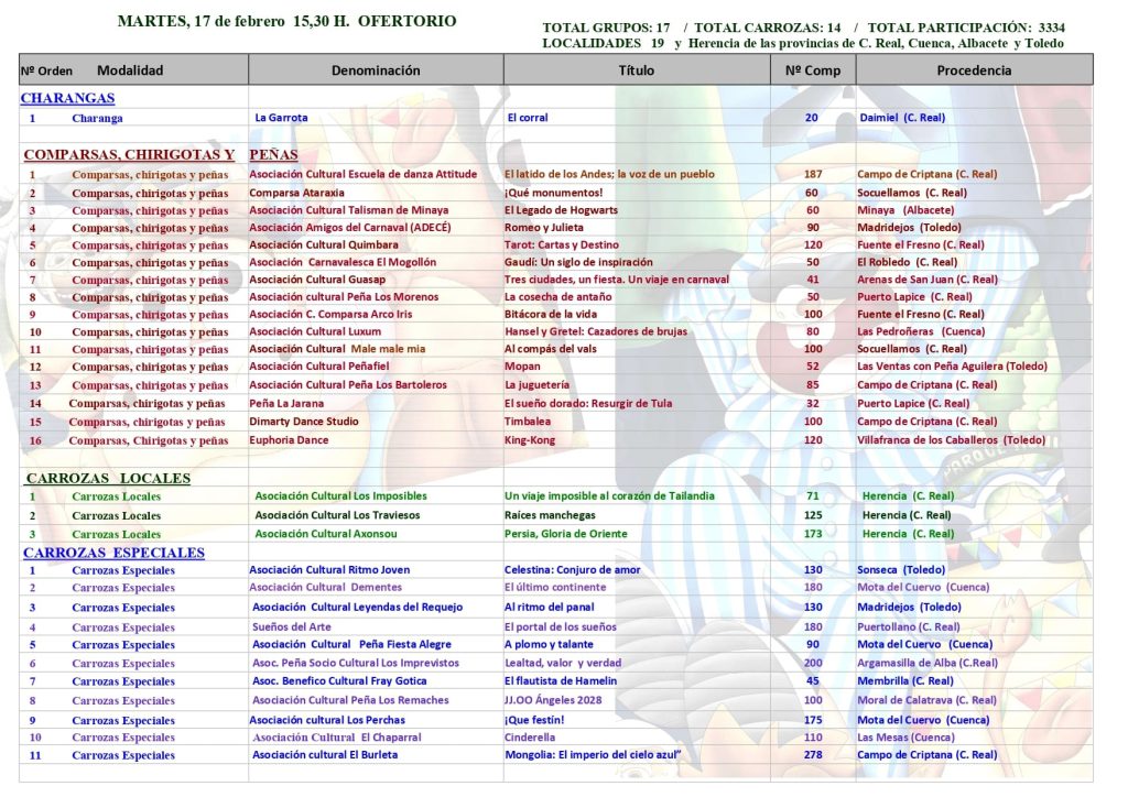 El Desfile del Ofertorio vuelve a ser el corazón del Carnaval de Herencia. En 2026 reunirá 3.334 participantes, con 31 agrupaciones procedentes de 19 localidades de Ciudad Real, Cuenca, Albacete y Toledo.